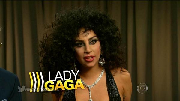 Gaga in her iconic black jumpsuits with the black/red/white hood.