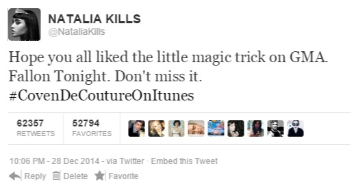 With the release of her new single “Coven De Couture” this morning, Natalia Kills and her team show no signs of backing down anytime soon. After appearing on GMA this morning, the poster of the single went up on Times Square and will be there for an extended period of time. On lookers were more than excited to see it and as soon as it came on for the first time, New York cheered loud and wild. Alongside the showcasing of the poster in Times Square, it was also announced that Natalia Kills would be joining the Jingle Ball lineup from here on out. It’s a really good day for Kills fans.