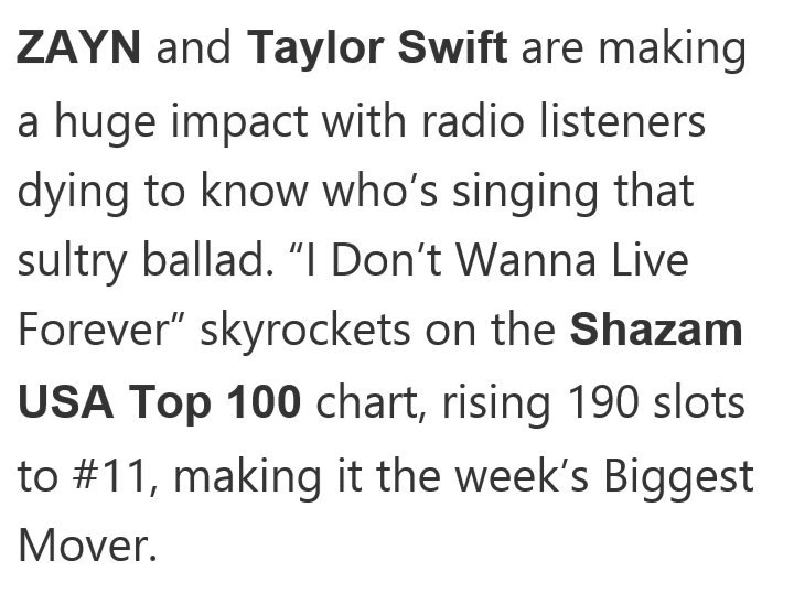 So why then is a sultry duet from two theoretically big names stranded rather startlingly at Number 16? Needless to say it is all down to streams - or rather the lack of them. I Don't Wanna Live Forever was on Google, Apple, Deezer and I believe even Tidal but was entirely absent from Spotify. Whether that was down to Taylor Swift's continuing boycott of the platform or because of some odd exclusivity deals is not clear. But it mattered, given that Spotify's market share is anything up to 60%. No Spotify means fewer streams and severely depressed chart placing. Indeed the single fails to register as one of the 100 most streamed tracks of the week. Which is a big ouch.