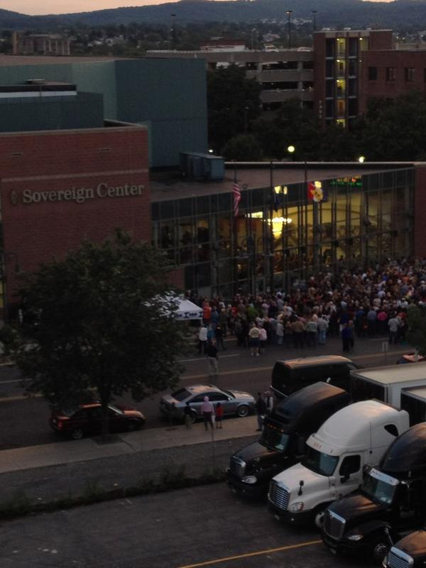 Midway through her show at a filled Sovereign Center, the country-pop star and three of her bandmates performed six songs while hovering above the crowd on a chunk of stage.