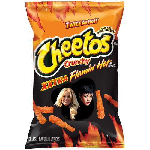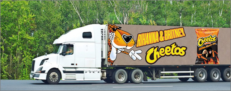 Today it was announced that Rihanna and Britney signed a deal with a food company, but no one knew what company they signed for. There were many guesses, but no one knew the right answer. A few hours passed until one fan saw a truck that was with a baner and on banner there was a pack of chips with Rih’s and Brit’s faces, and the snack company is none other than cheetos. On banner there is a cheetos logo with Rih’s and Brit’s name and cheetos tiger is also in the banner. + special edition snacks pack.
