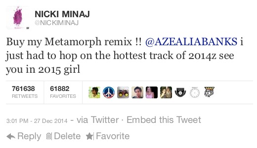 Azealia Banks released the Remix EP for her hit single Metamorph today. The EP contains remixes by hit DJs and producers like Mike Will and Paul Oakenfold. The remix EP even contains an official remix that features Nicki Minaj. The two rap artists are expected to perform the song in the near future, though no official announcements have been made. The Nicki Minaj remix is being sent to urban radio immediately, hoping to win the urban audience who has loyally supported the rest of Azealia's music. The rest of the remixes are being sent to clubs around the world and are already being added to thousands of DJ setlists. The remix EP has already gotten success as the Mike Will remix and the Nicki remix both entered the top 50 on iTunes. #MetamorphRemix was trending worldwide for hours on Twitter, most of the tweets being from excited fans talking about Nicki and Azealia's collab everyone had been waiting for.