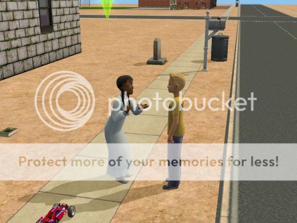 Btw, the grave you see behind Anthony and Bonnie is that of Dagmar Bertino. Lightning struck one of Alora's pink flamingoes one stormy night and...go figure...for once the rain as soon as lightning strikes. I didn't do anything because everyone was inside and safe. But as soon as Dagmar caught on fire I tried calling the fire department, but she died as soon as they got onto the lot. She nows haunts the lot, and is also ineligible for the Blonde Ambition Legacy