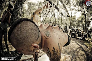 Nasiir hanging from a tree by ropes with hooks embedded in his back and jaw. Blood was everywnere